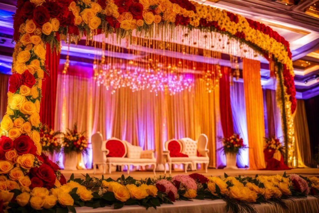 • Sangeet indoors with stage depth and warm uplights (not neon).