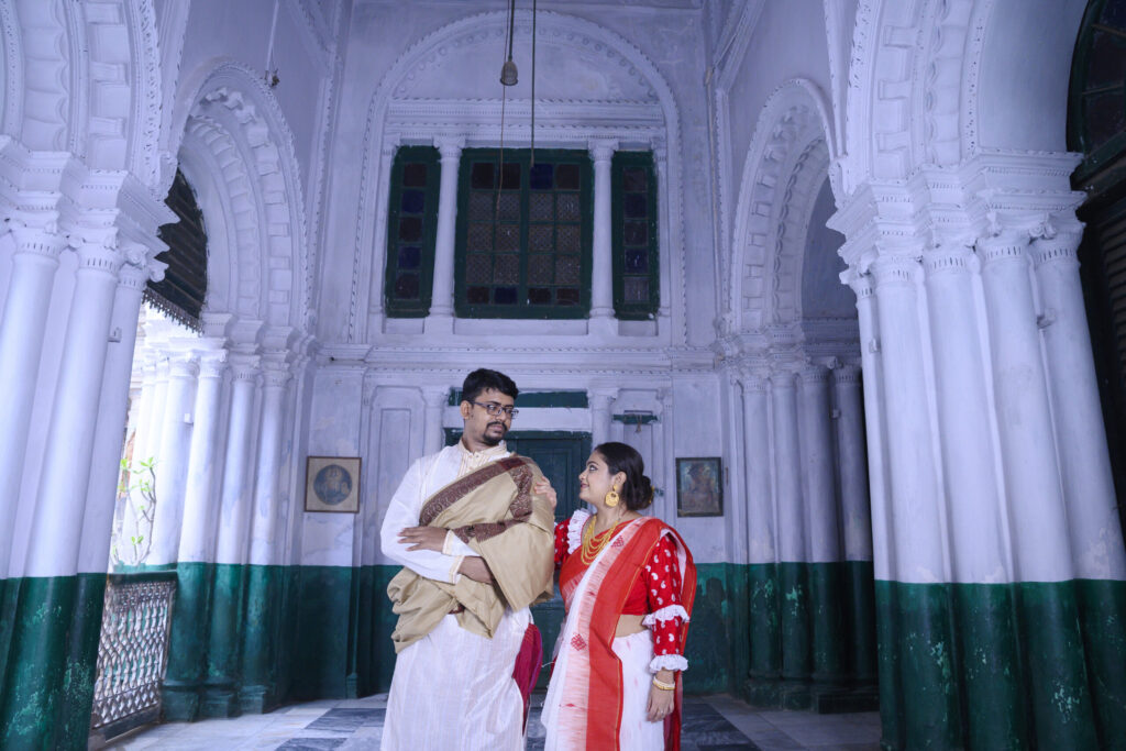 A traditional bengali look photographs beautifully indoors. For the groom’s groom attire, try dhoti kurta in classic white or ivory, maybe with a nehru jacket. Keep the bride’s saree silk with minimal embroidery for a clean, elegant vibe. One slow walk + hand-hold + side glance = done.